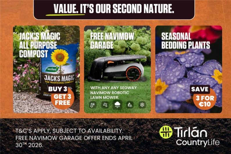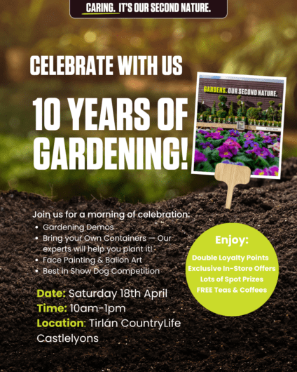 Tirlán CountryLife Castlelyons are celebrating 10 years of Gardening this year! We invite you to join us for a fun-filled morning of gardening demos and container planting, face painting and ballon art, ‘Best in Show’ Dog competition and refreshments. Enjoy Double Loyalty Points, amazing offers in-store, including a FREE Navimo Garage with any Navimo Segway purchased that day!
